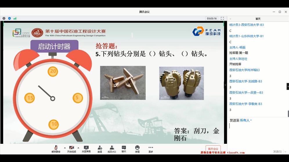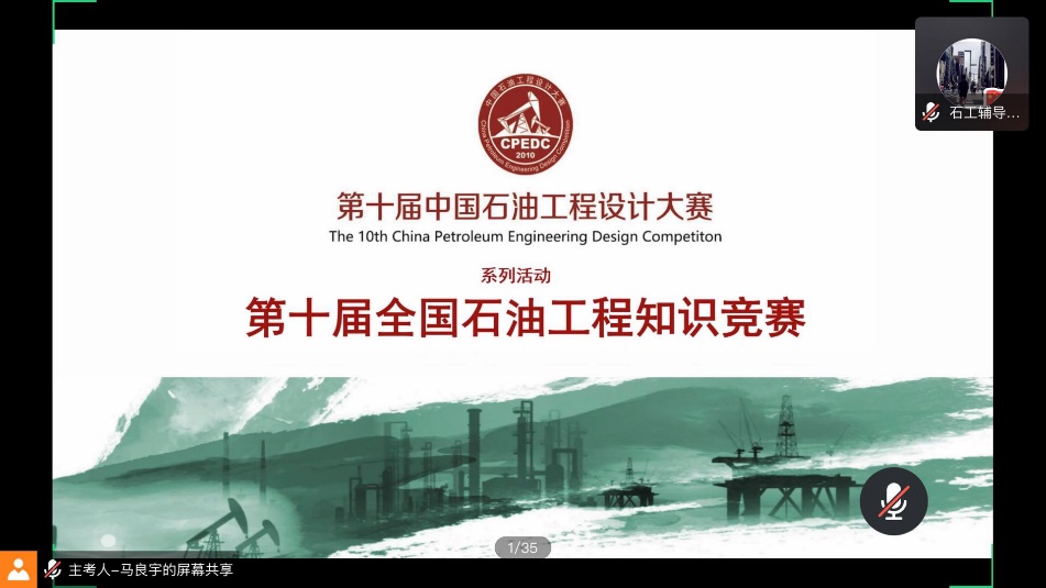 6月13日上午,第十届中国石油工程设计大赛系列活动之“宁波锋成杯”第十届全国石油工程知识竞赛在线开展。中国免费靠逼视频(北京)石油工程学院韩国庆教授、中国免费靠逼视频(华东)张卫东教授、东北免费靠逼视频曹广胜教授、燕山大学李子丰教授担任评委,赞助企业宁波锋成先进能源材料研究院副总经理余波、人力资源总监胡敏参加了活动,来自全国20所高校及科研院所的80名学生线上参加了比赛,500余名师生通过直播观看了比赛。